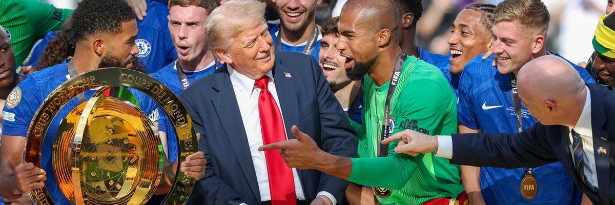 Donald Trump never misses an opportunity to make something all about himself, and even the Club World Cup is no different.The president was on hand Sunday to present the trophy to the winning team. But when he passed the gleaming trophy over to Chelsea F.C. team captain, Reece James, Trump just....stuck around.Videos of the spectacle seem to show the soccer players waiting for Trump to get out of the way so they could take their victorious team photos. Even FIFA President Gianni Infantino, who has close ties to Trump, tried to lead him away, only to be ignored and eventually dismissed. — (@) "I’m actually dying at this video Chelsea players were waiting for trump to leave but he didn’t" — (@) "Chelsea trying to celebrate winning the World Cup with Trump in the way is FRYING ME" — (@) The team wound up having to celebrate with Trump front and center, although they were eventually able to get him to move to the back for some of the photos. One of these ultimately served as the photo chosen by @ChelseaFC to post on social media, with only a sliver of Trump in the background, crashing their pic. — (@) The whole thing was an utter embarrassment, leading to folks photoshopping Trump out of the pictures entirely. (Initially, there were rumors that the football club was behind this, but those were disproven.) — (@) To add further insult, it was later reported that the trophy in question was a mere replica — Trump claims Infantino told him he keep the real $230,000 trophy in the Oval Office "forever." — (@) Absolute clownery, but what else would we expect?