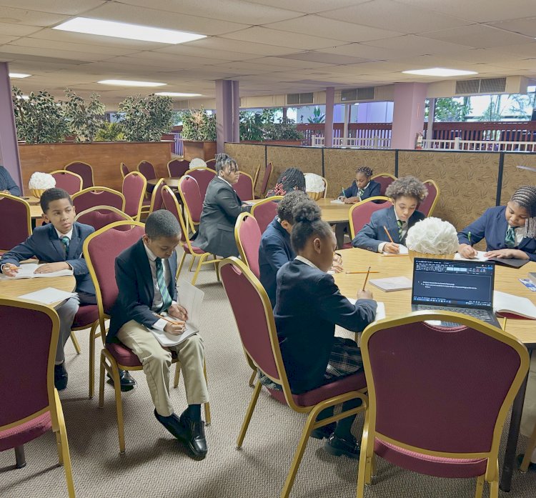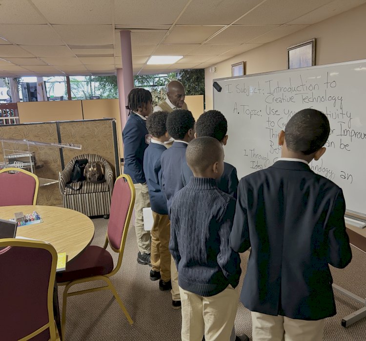 C-Prep K–2nd grade students taking notes during College of Liberal Arts for Kids with Headmaster and Founder, Dr. Oscar J. Nelson Dowdell-Underwood, as they learn about Creative Technology.