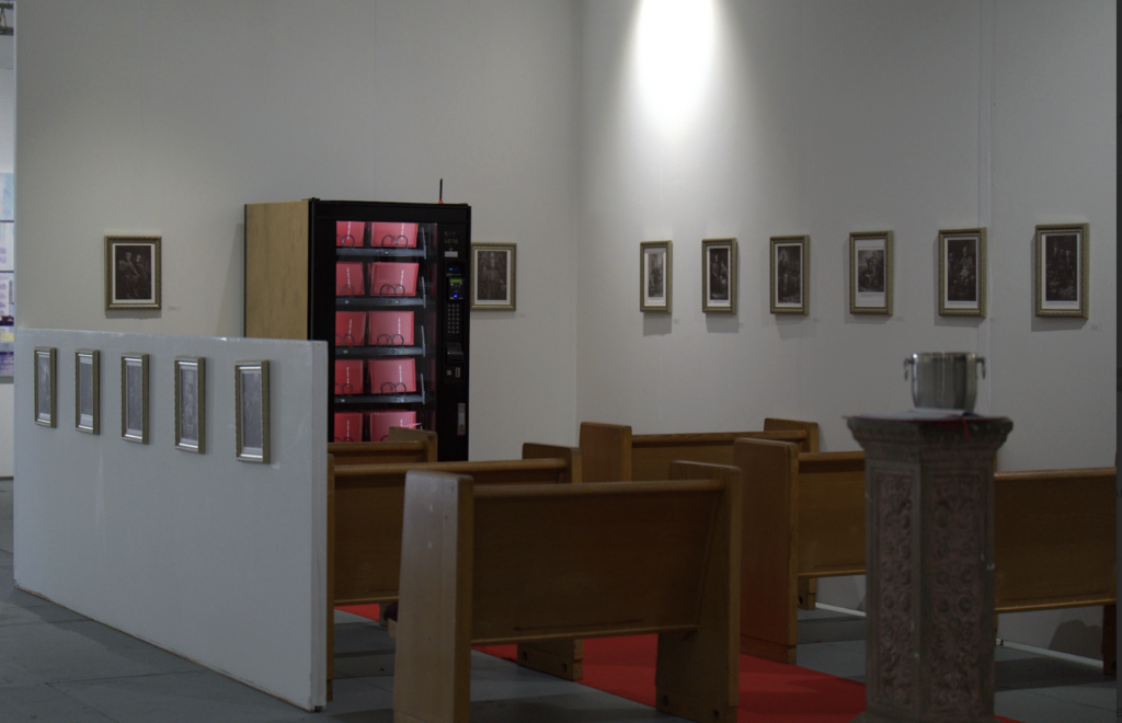 Access to The Holy Babble! is available through a credit-card-operated vending machine, positioned at the altar, serving as the exclusive point of distribution. Each copy is priced at $45.47, a deliberate reference to Donald Trump’s position as both the 45th and 47th President of the United States embedding the project’s central thesis within the act of acquisition itself.