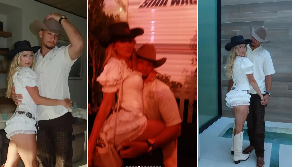 Patrick rocked a beige cowboy hat, a light button-up shirt, and brown checkered pants. Brittany stepped out in black cowboy boots and fitted white lace shorts layered with a structured white corset.