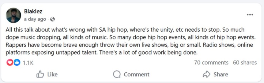 “All this talk about what’s wrong with SA hip hop, where’s the unity, needs to stop,” he wrote, highlighting the steady stream of quality music, diverse sounds, and a growing number of live events shaping the culture. He pointed to artists who are boldly hosting their own shows, whether intimate or large-scale, alongside radio platforms and online spaces that continue to spotlight emerging voices.
