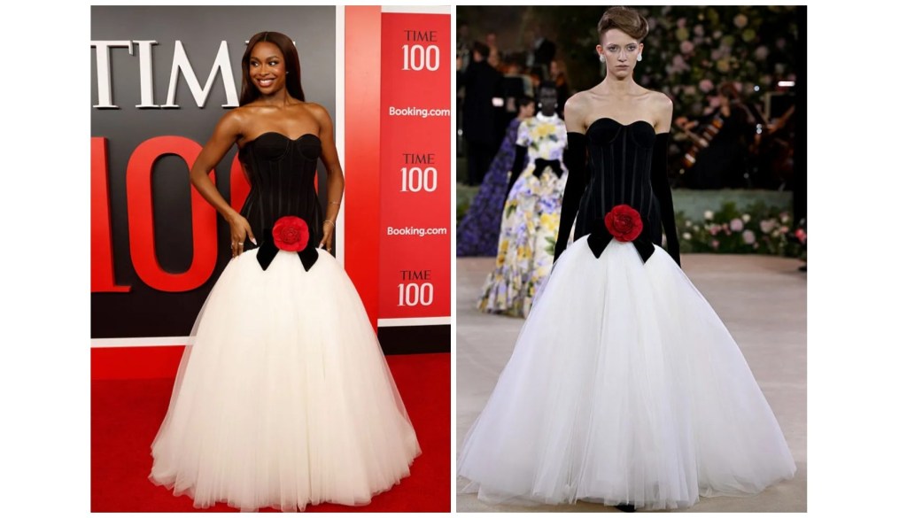 Coco posed in a striking Richard Quinn gown that gave corset drama, soft volume, and a pop of red romance. The black bodice framed her beautifully, showcasing her curves and glowing chocolate skin. From there, the dress opened into a wide white tulle skirt, finished with a large red flower at the waist.
