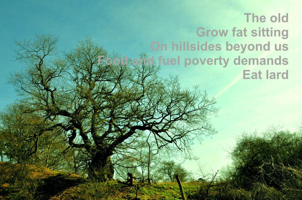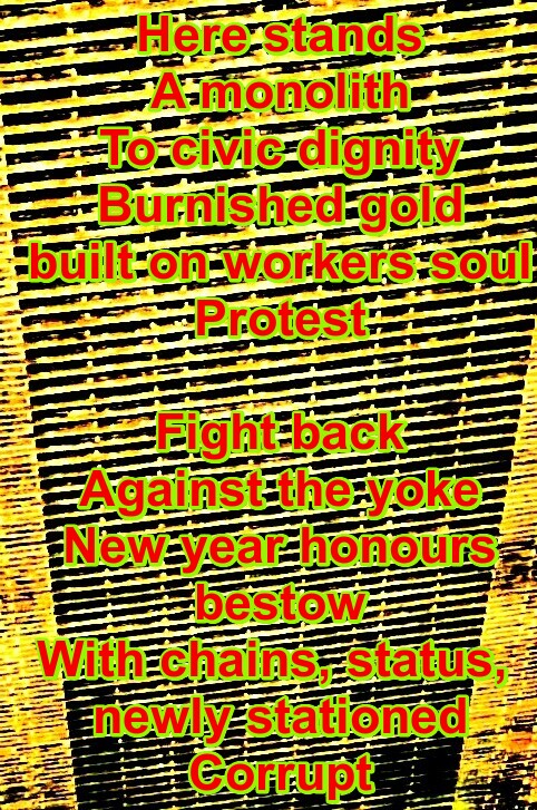 Side by side they walkThrough a puddle to the skyWill shehold her hand Richard Downes4th January 2021 The Oldgrow fat sittingon hillsides beyond usfood and fuel povert demandseat lard Richard Downes5th January 2021 Here standsa monolithto civic dignityBurnished goldbuilt on workers soulPROTEST Fight backagainst the yokeNew year honours bestowwith chains, statusnewly stastionedcorrupt Richard Downes7th January ... 5 PIX + These White Walls (Poem)