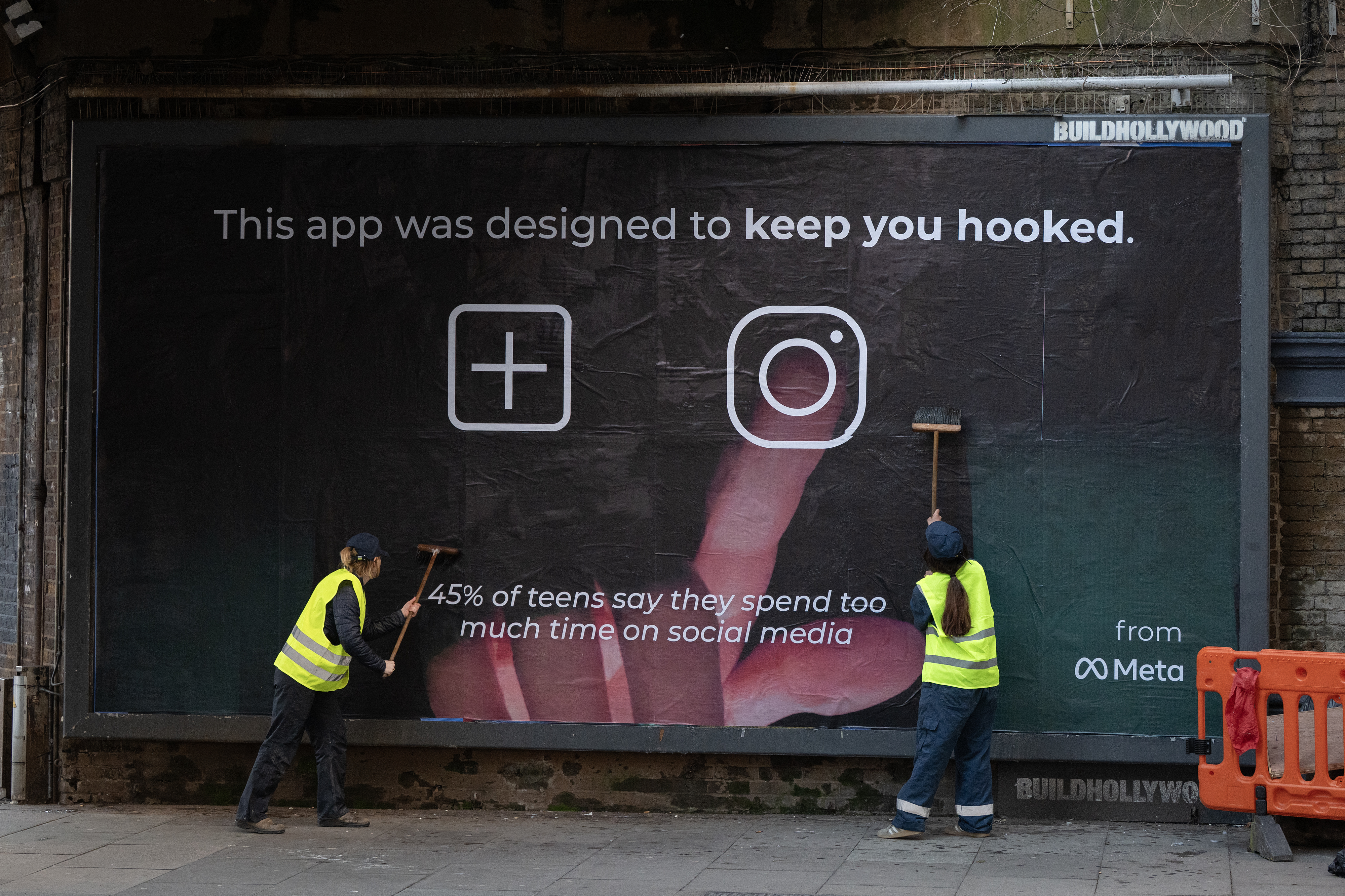 The ads suggest that the business models of major platforms such as Meta and the app TikTok are part of the problem: “This app was designed to keep you hooked,” one billboard reads alongside a photo of Mark Zuckerberg. “If you feel worse, it’s working”.