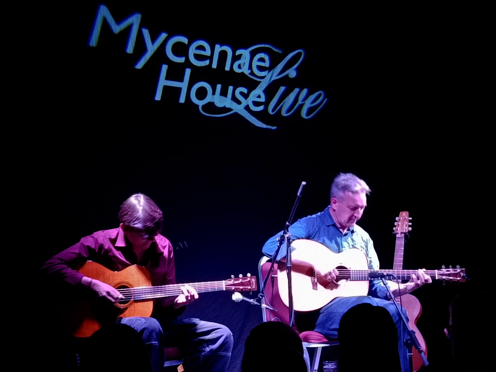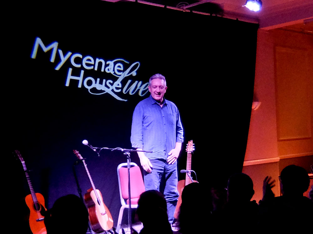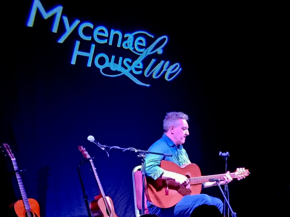 Mycenae House is a community centre occupying a historic building in the leafy suburb of Blackheath. It’s an intimate space with good acoustics, the bar prices are reasonable and, on a Friday night, I find it’s fairly packed. As I’m arriving, I bump into Clive, clutching two guitars, and say hello. He tells me he’s going to be playing a lot of new material and trusting it all goes well.