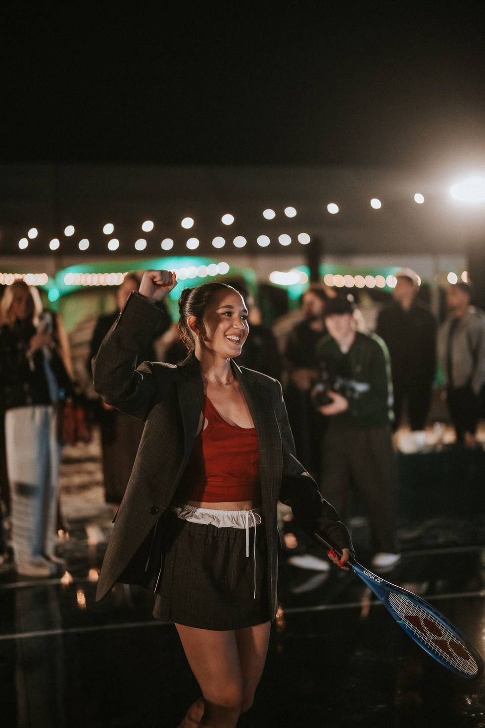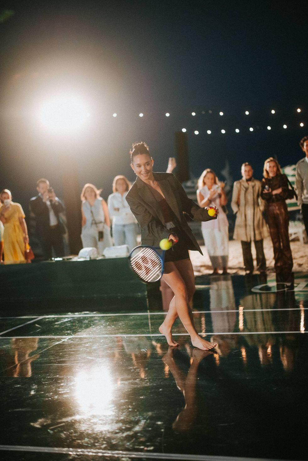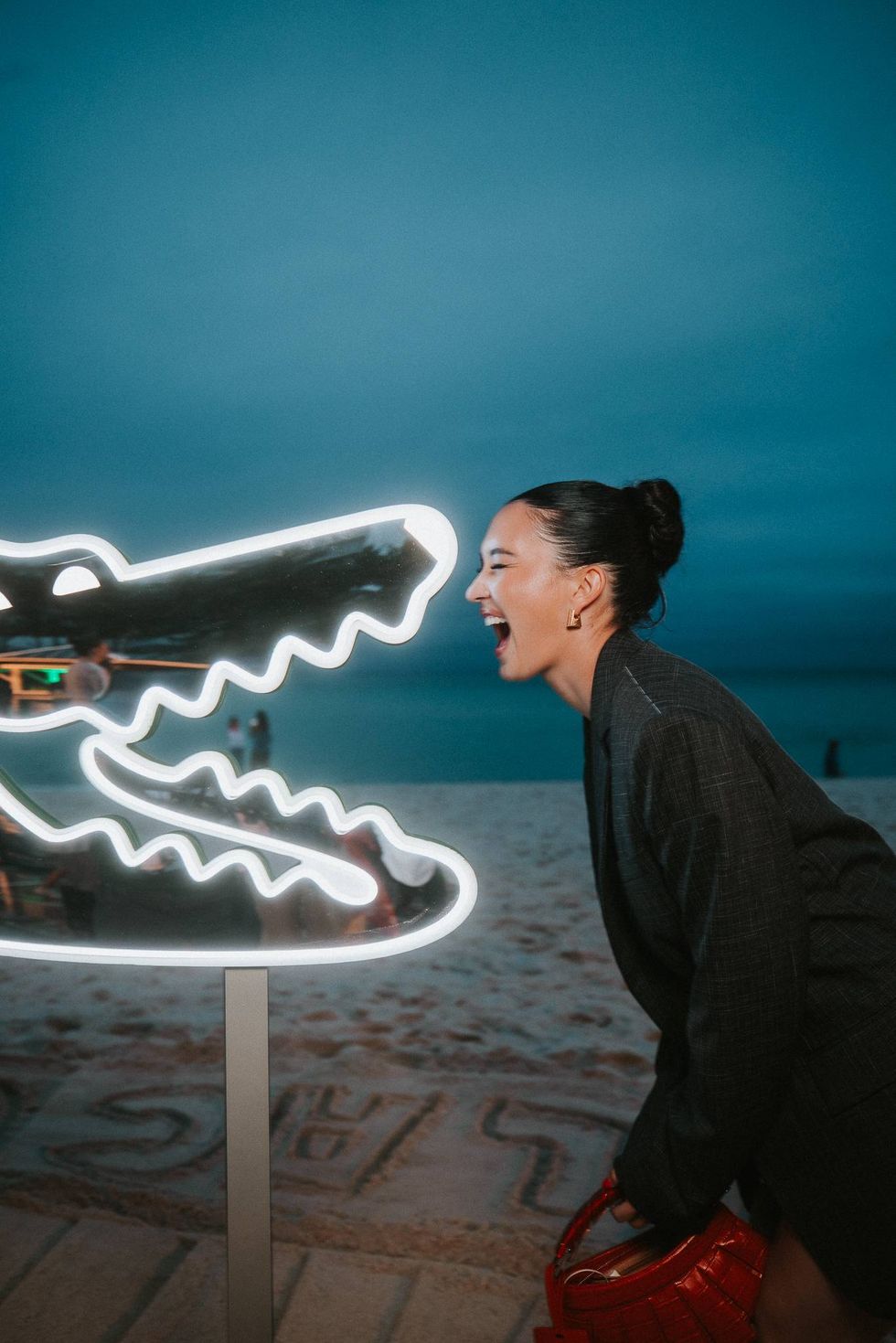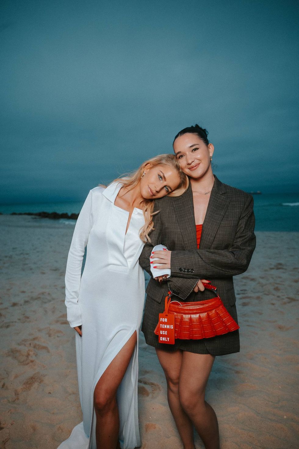 I think the biggest it-piece is the bag, inspired by a tennis skirt, for tennis use only, so I need to bring a little tennis flare to a little party. A very sandy look. Reminds me of Roland Garros which I'm going to be playing soon…A little cheeky, I like an oversize blazer, everything is Lacoste, down to the jewelry… It looks great. It feels great. Head to toe. All Lacoste.