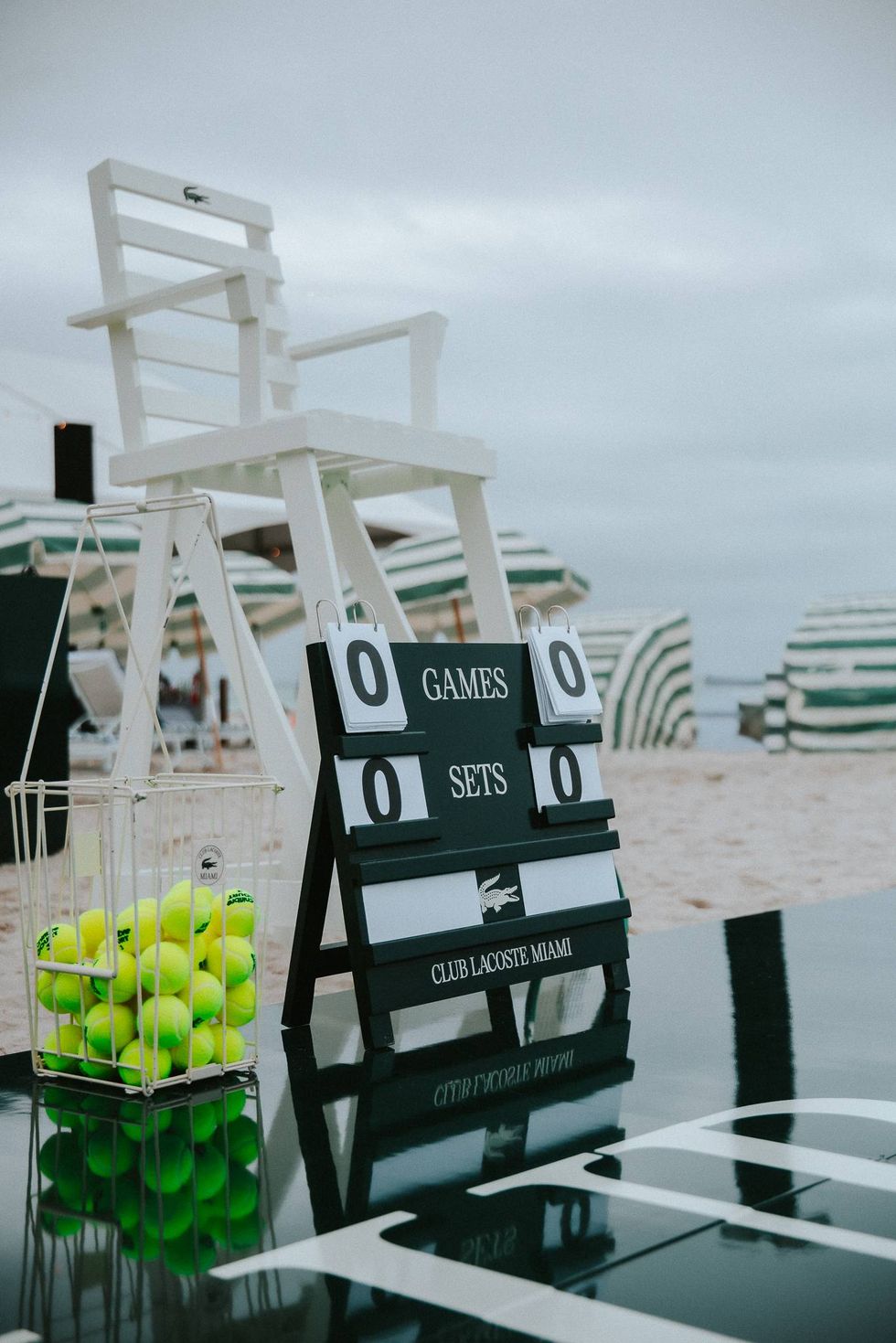 Club Lacoste brought tennis to Miami Beach with a full beach takeover. A dark-green tennis court served as the centerpiece, framed by white sand and the Atlantic. Club Lacoste beach huts lined the court alongside classic games for guests to enjoy.