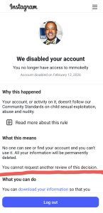 Was my account hacked by a nefarious actor who posted some offensive and obscene material? I can’t rule it in or out, as I don’t have access to my account to perform a forensic analysis of any logins from suspicious devices or the like. That, and I “cannot request another review of this decision.” Years of posts, pictures, commentaries, and discussions across TWO platforms, gone. And I can’t even verify whether the supposed violation occurred on Instagram or Threads.